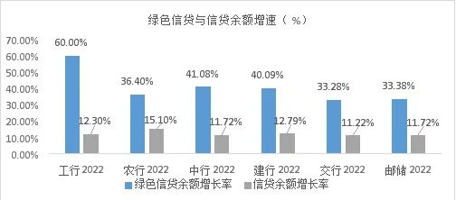 2022年,六大行绿色信贷余额较上年同比增长均超过30%,平均增速更是达到40.77%。同一时期,六大行全行信贷余额增速在11-16%的区间内,远远低于绿色信贷余额的增速。